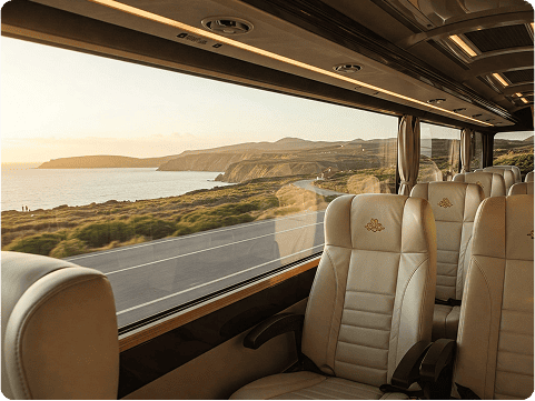 Luxuriate in our premium buses featuring rich leather seating and elegant wood flooring.